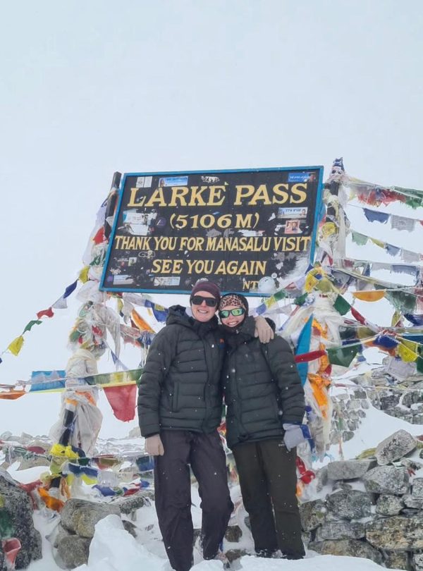 The journey reaches its high point at the Larkya La Pass (5,106m), where breathtaking